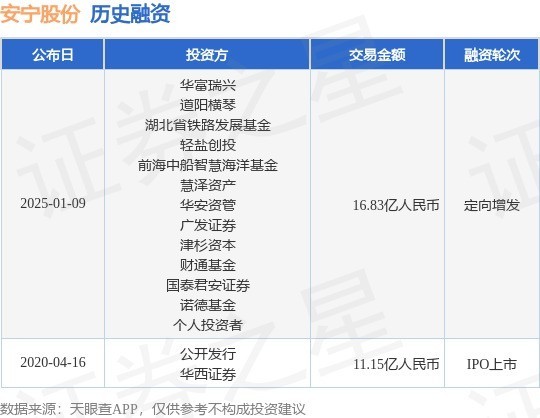 | 证券之星消息,根据天眼查APP于1月9日公布的信息整理,四川安宁铁钛股份有限公司定向增发融资,融资额16.83亿人民币,参与投资的机构包括华富瑞兴,道阳横琴,湖北省铁路发展基金,轻盐创投,前海中船智慧海洋基金,慧泽资产,华安资管,广发证券,津杉资本,财通基金,国泰君安证券,诺德基金,个人投资者。